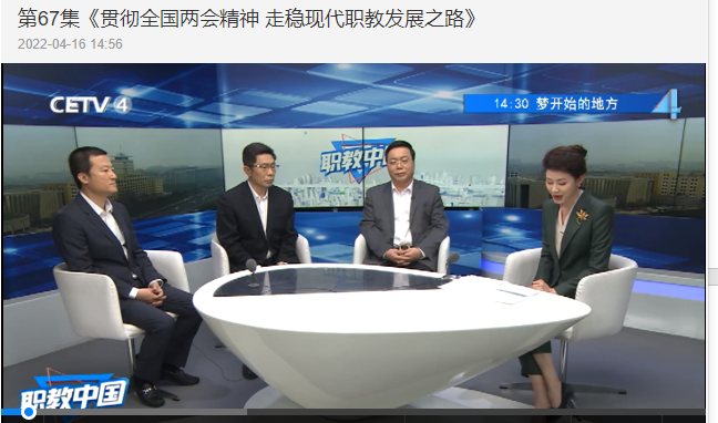 近日,中國教育電視臺《職教中國》欄目播出《貫徹全國兩會精神走穩(wěn)現(xiàn)代職教發(fā)展之路》,我校安江英校長作為受邀嘉賓,就今年“兩會”在部署職業(yè)教育工作時(shí)要求“發(fā)展現(xiàn)代職業(yè)教育體系”“改善辦學(xué)條件”“完善產(chǎn)教融合的辦學(xué)體制”“增強(qiáng)職業(yè)教育適應(yīng)性”等話題進(jìn)行探討,深度解讀如何抓住發(fā)展現(xiàn)代職業(yè)教育的歷史機(jī)遇,進(jìn)一步改善辦學(xué)條件夯實(shí)育人基礎(chǔ),不斷增強(qiáng)職業(yè)教育適應(yīng)性,完善產(chǎn)教融合辦學(xué)體制助力校企協(xié)同育人,提升職業(yè)教育的認(rèn)可度。
