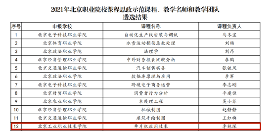 近日,北京市教育委員會對“北京市職業院校課程思政示范課程、教學名師和教學團隊”的評選結果進行了公示。我校申報的《單片機應用技術》《工程數學》《地理信息系統應用》3門課程全部入選北京市課程思政示范課程,3門課程的授課教師和教學團隊入選北京市課程思政教學名師和教學團隊。