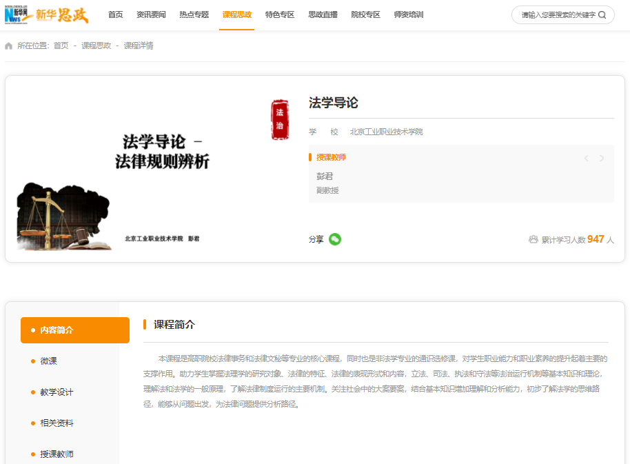 彭君老師所授課程《法學導論》作為全國高校優秀課程思政示范案例課上線 “新華思政教學資源服務平臺”