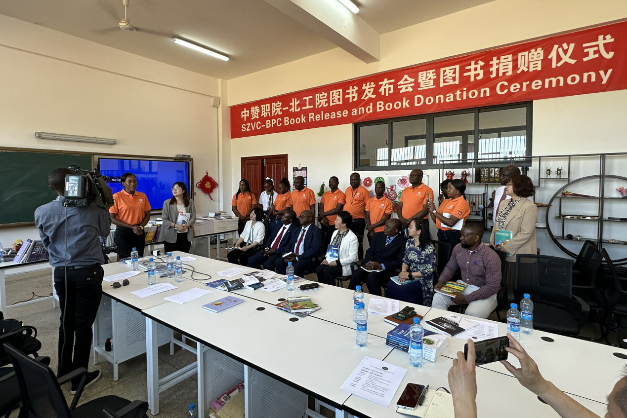 田紅芳代表學校向中贊職院捐贈了6套共300冊英文版專業教材,捐贈了中國教育部語合中心《職通中文》系列教材、《中國職業教育工業漢語》系列叢書等專門用途漢語圖書100冊,HSK標準教程等中文教學或中國文化類書籍300冊。我校國際處處長孟晴介紹了教材開發和出版情況,巫梅琳代表北京市教委向與會來賓推介了“留學北京”品牌,歡迎和鼓勵贊比亞當地優秀學生到北京學習交流。