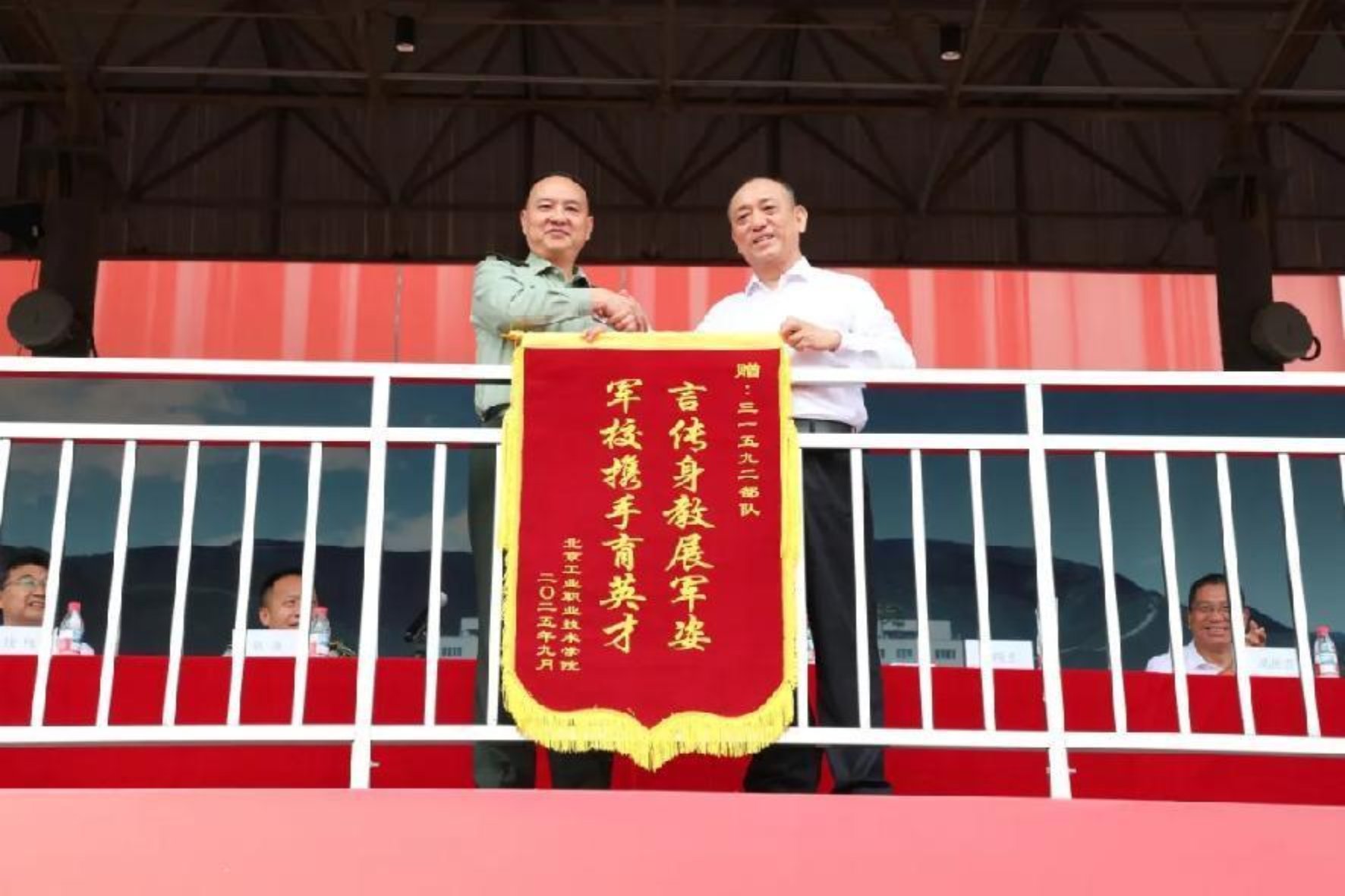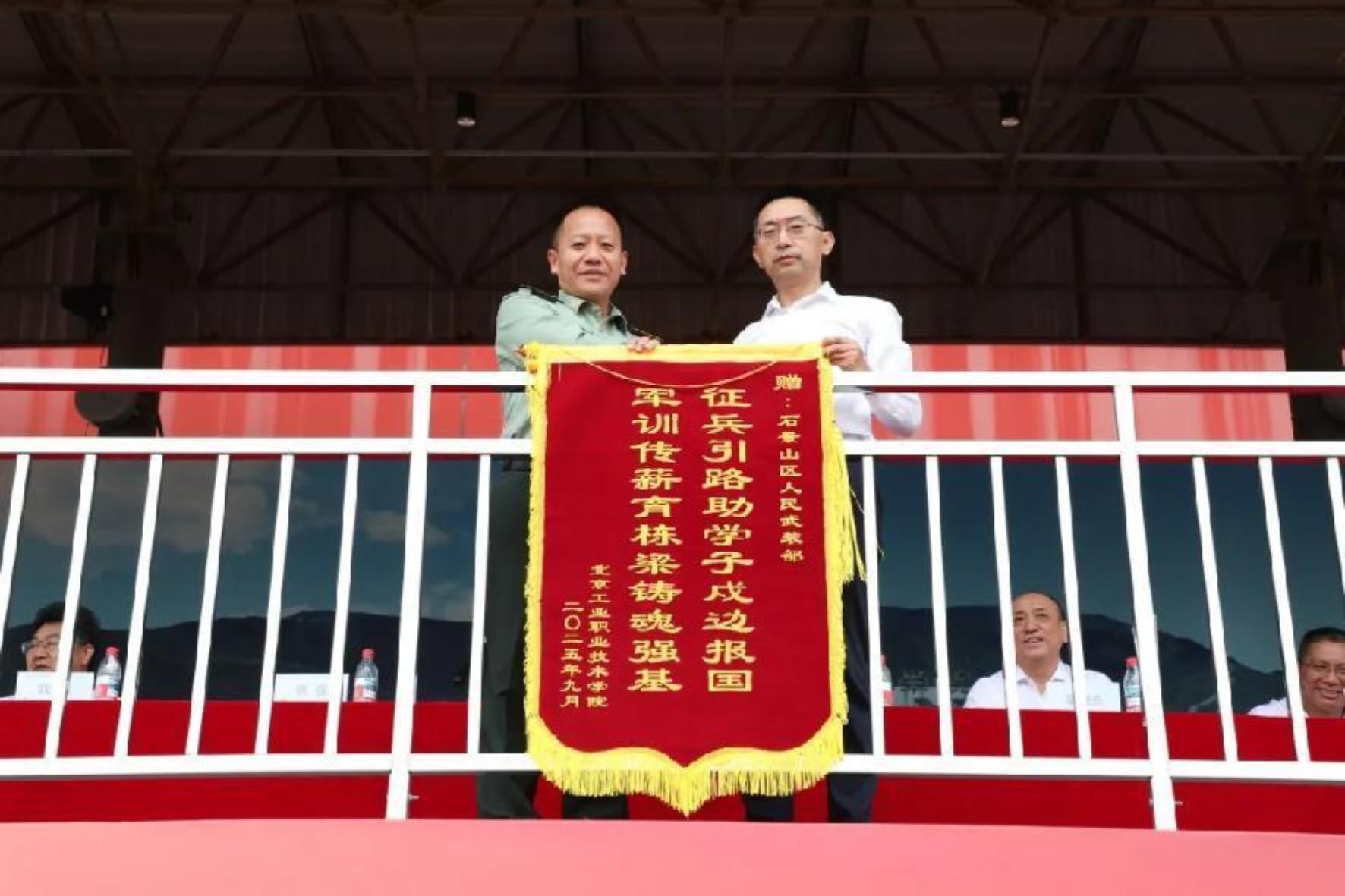 柳長安向石景山區人武部贈旗,對其長期以來在學校軍訓組織、征兵工作指導等方面的大力支持表達誠摯敬意!魏曉東代表學校向承訓部隊贈送錦旗,感謝教官們以專業的軍事指導、嚴謹的作風態度,為新生錘煉意志、塑造品格。