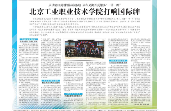 5月27日,《北京日報》聚焦我校“雙高”“特高”建設取得的顯著成效,專版報道了我校國際化辦學取得的豐碩成果。近年來,學校黨委高度重視國際化工作,確立“高端化、精品化、信息化、國際化”辦學定位。作為國家雙高、北京特高重要建設任務之一,學校國際化從職教“走出去"試驗田到引領標準落地,從布局海外到服務“一帶一路”,打響了國際牌。現將全文轉載如下: