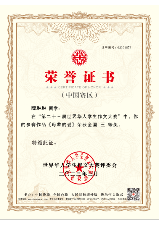 李子恒、侯子木、隗琳琳三名同學(xué)在中國(guó)僑聯(lián)、全國(guó)臺(tái)聯(lián)舉辦的“第二十三屆世界華人學(xué)生作文大賽”中榮獲全國(guó)三等獎(jiǎng)。