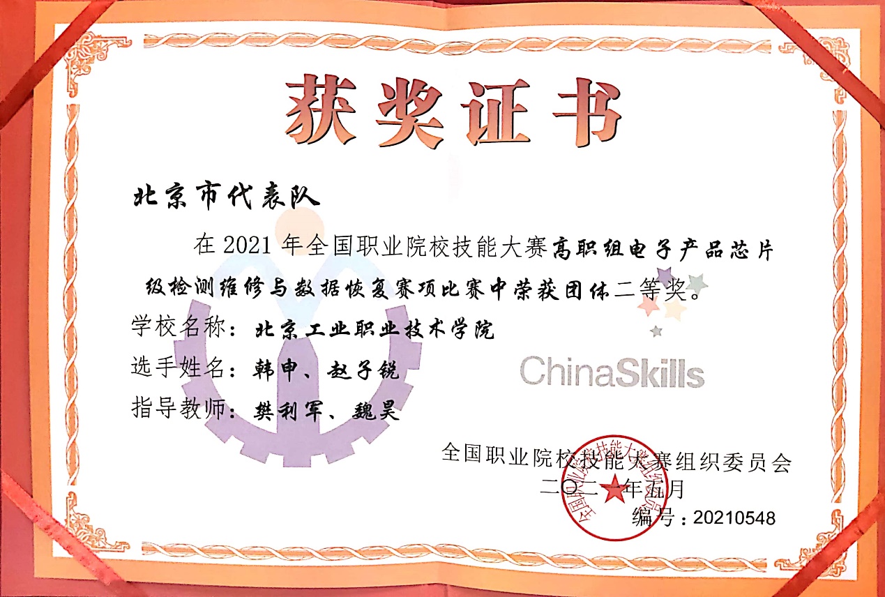 2021年6月4日至6月5日全國職業院校技能大賽高職組“電子產品檢測維修與數據恢復”賽項,6月8日至6月10日“云計算”賽項分別在山東濟南舉行。來自全國多所高職院校的優秀選手,代表各自省、自治區、直轄市參加了比賽。我校電信學院代表北京市組隊出征參加了兩個賽事,經過激烈角逐,最終電子信息專業趙子銳、韓申2名學生喜獲電子產品檢測維修與數據恢復賽項全國二等獎,網絡技術專業學生劉若檀喜獲云計算賽項全國三等獎。