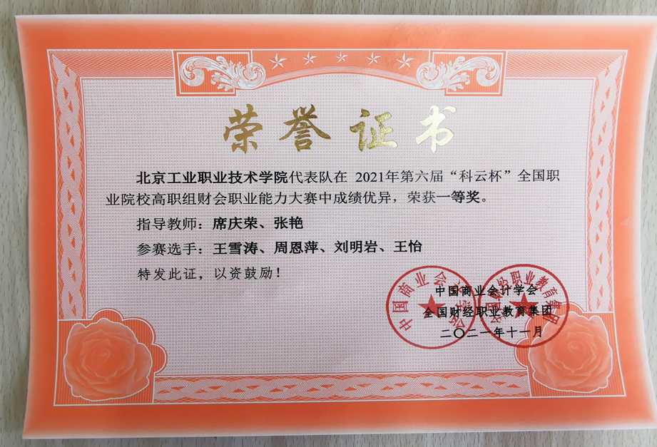 2022年11月26日-27日,全國職業院校“網中網杯”大數據會計技能大賽如期在線上舉行,大賽由中國商業會計學會主辦的、全國近200所院校參加。文法與管理學院席慶榮、李冬嵬兩位老師帶領大數據與會計專業2131班高卉攸、趙雨蝶、孔堯、朱玉環4名學生參加比賽。經過激烈角逐,最終榮獲華北區域賽一等獎的好成績。