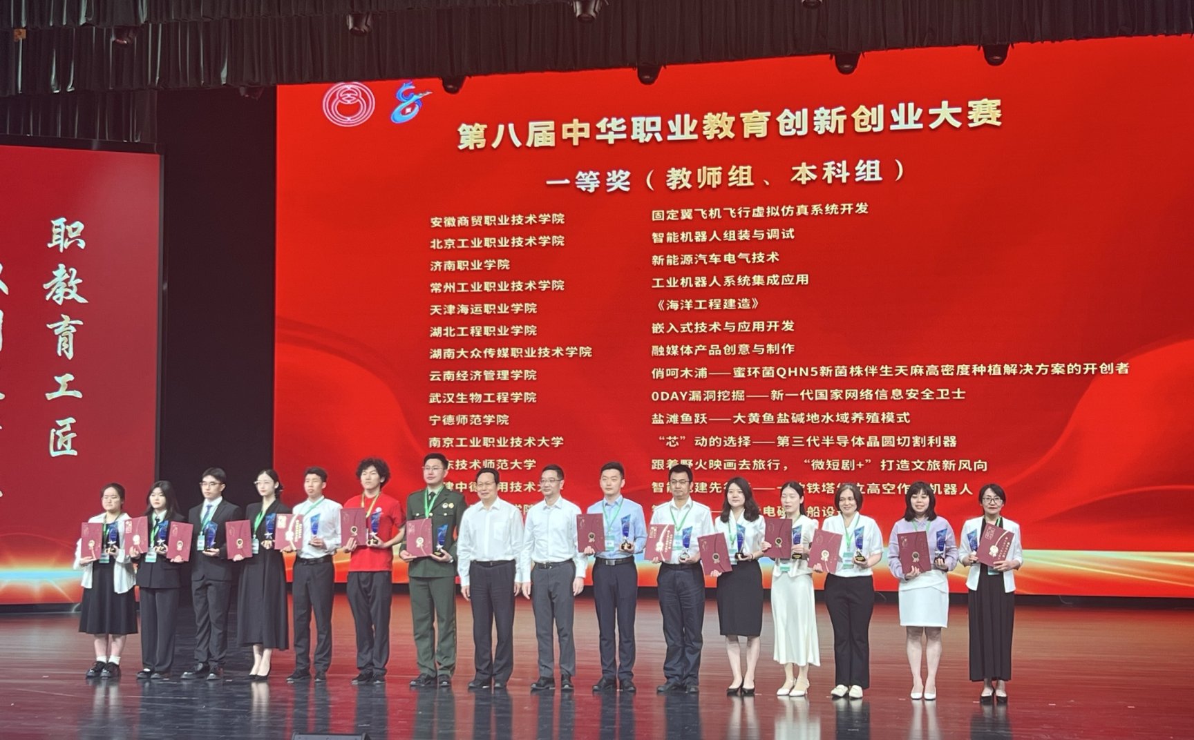 在 5 月 28 日至 30 日于湖北黃石舉辦的第八屆中華職業教育創新創業大賽全國總決賽中,我校機電工程學院李淼、黃歡、譚穎琦、李巖磊四位教師組成的團隊,憑借 “智能機器人組裝與調試” 課程實訓項目,在全國 166 支精英隊伍中脫穎而出,一舉斬獲教師組全國一等獎,并在競爭激烈的裝備制造大類項目中取得全國第一名的好成績!