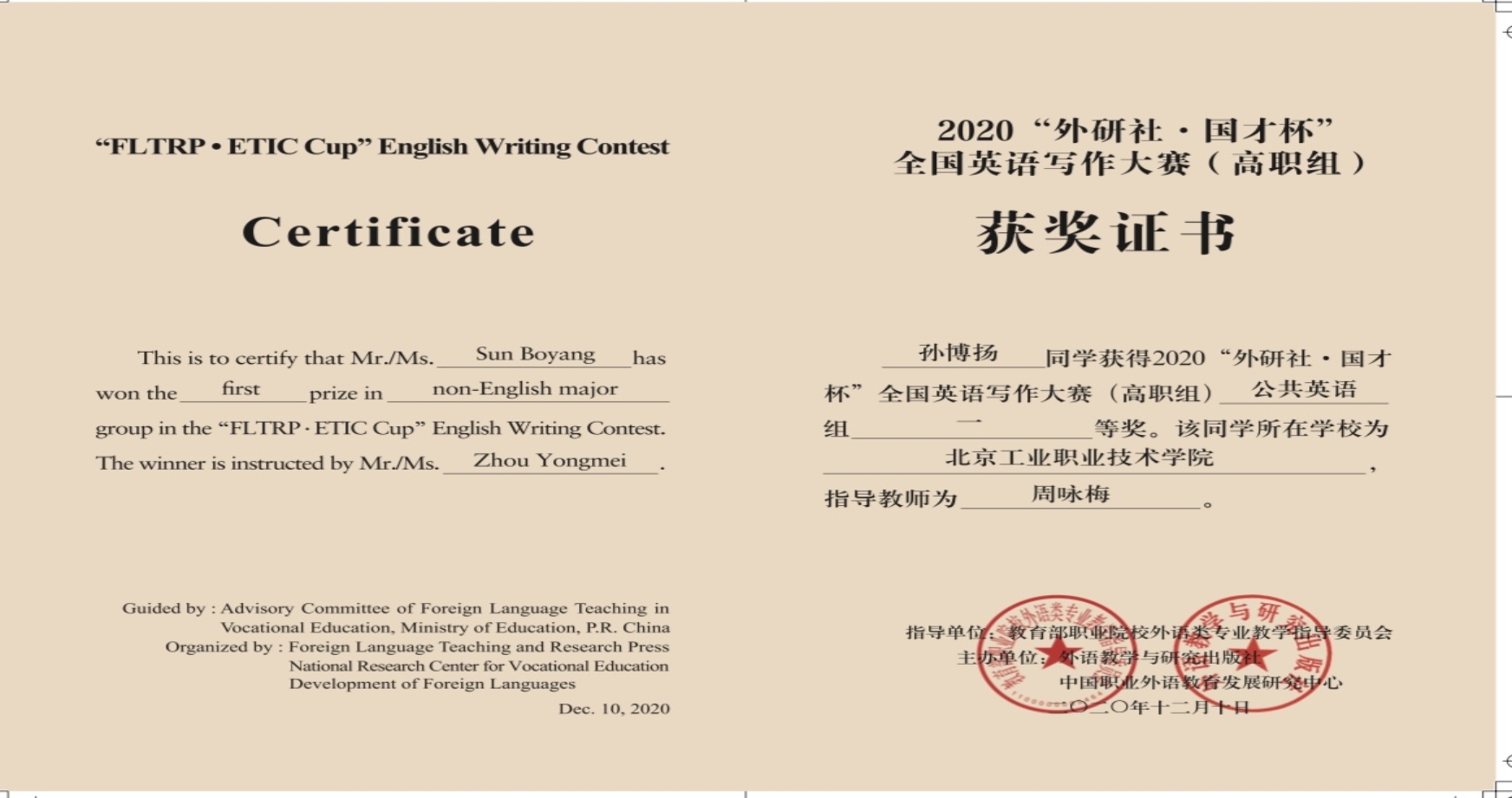 2020年12月10日,“外研社.國才杯”全國英語寫作大賽(高職組)成績出爐,來自全國28個省、市、自治區(qū)的122名選手參加競技,決出一等獎10名,二等獎30名,三等獎82名。我校機電1831班的孫博揚同學代表北京市參加了此次大賽,獲得一等獎,指導教師周詠梅老師獲得指導教師一等獎,實現(xiàn)了我校在該賽項上一等獎零的突破!