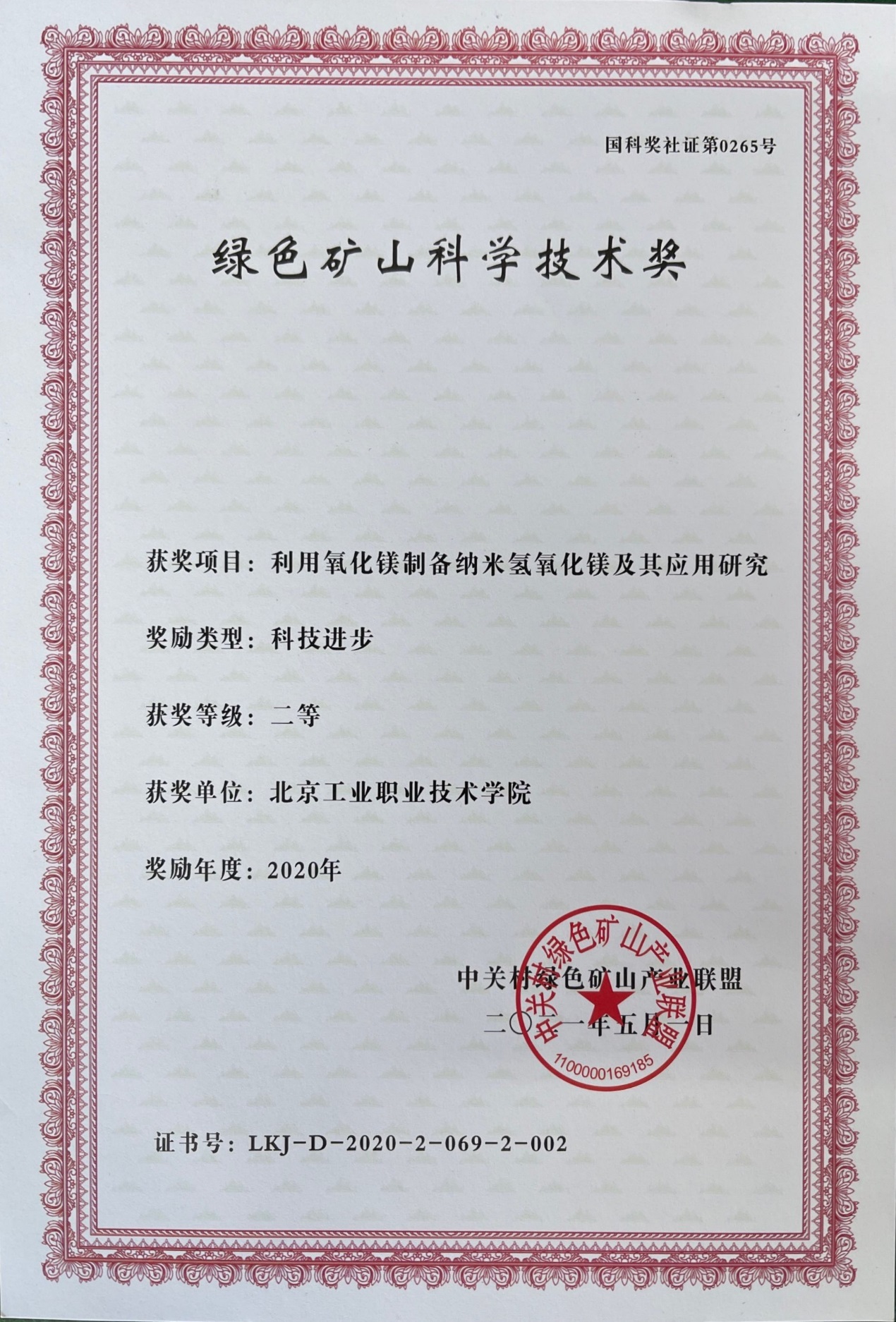 由中國地質大學(北京)、北京工業職業技術學院、北京依依星科技有限公司三家共同申報的“利用氧化鎂制備納米氫氧化鎂及其應用研究”項目獲得了“綠色礦山科學技術獎科技進步類二等獎”。該項目是由我校王佼教授、中國地質大學(北京)杜高翔副教授帶領的科研團隊多年持續研究的成果。