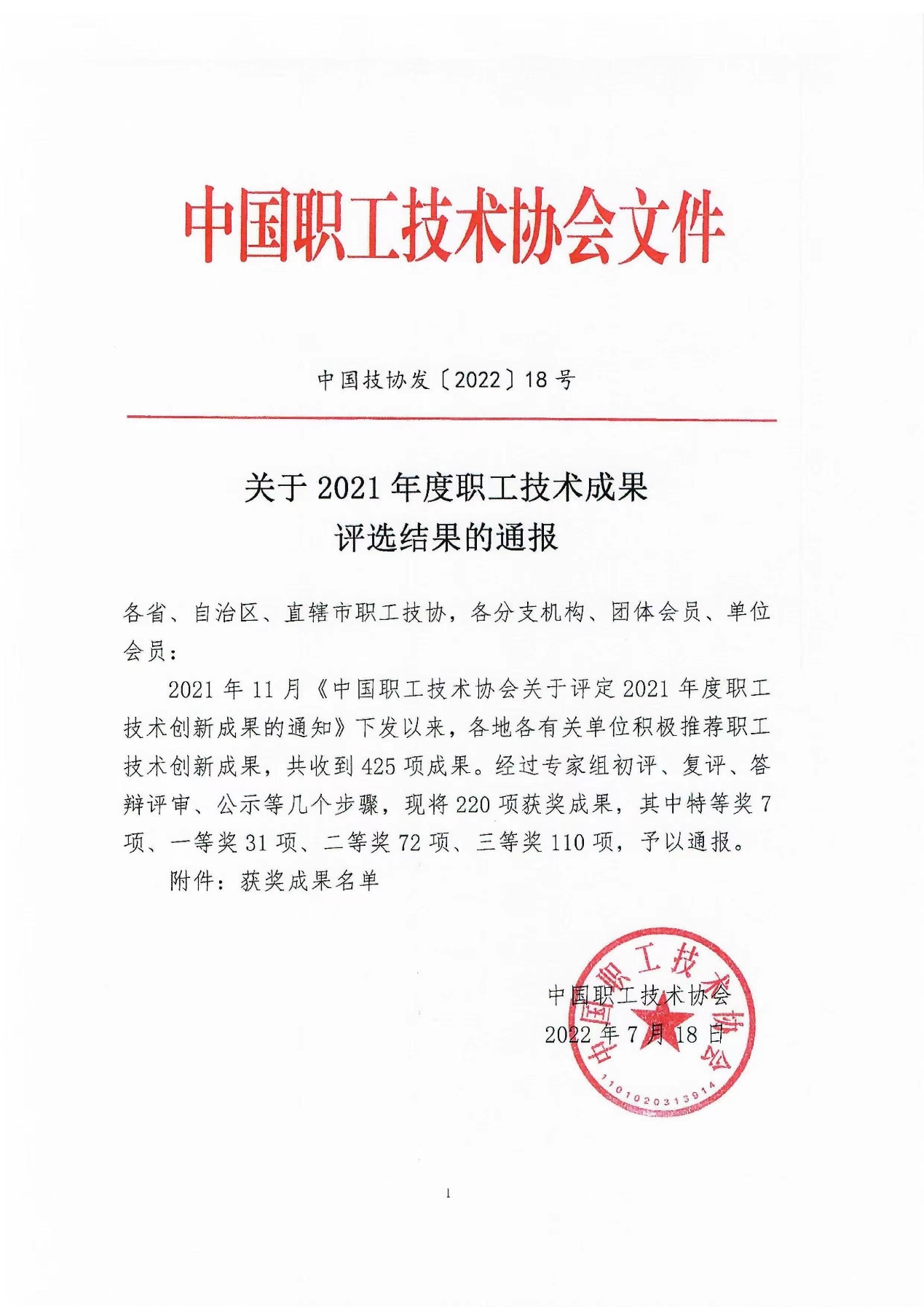 中國職工技術協會組織開展了2021年度職工技術創新成果評審活動,共收到來自全國各行各業的企事業、科研院所、高等院校等會員單位推薦申報的科技成果425項。經過專家組初評、復評、答辯評審、公示,共評出獲獎項目220項。其中特等獎7項、一等獎31項、二等獎72項、三等獎110項。