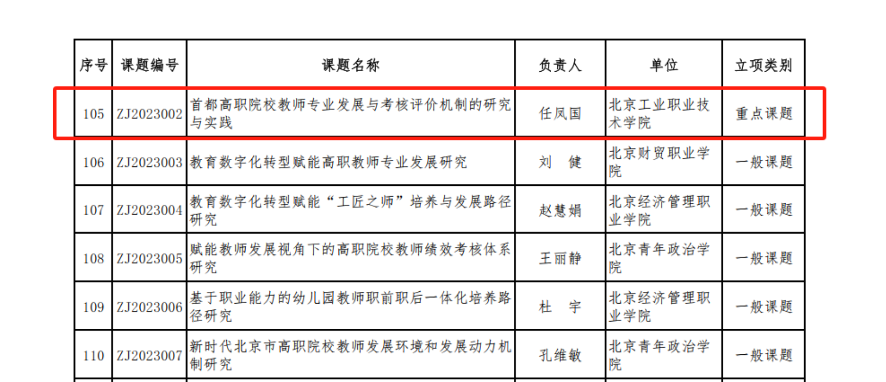 由任鳳國教授牽頭,姚寶珍、王軍紅、侯瑾等同志共同申請的《首都高職院校教師專業發展與考核評價機制的研究與實踐研究》入選首批北京市教師發展研究高職院校組兩大重點課題之一。北京市教委教師發展研究課題是北京市教委、北京市教師發展中心首次就教師發展問題進行專題立項,共18所本科院校和4所高職院校獲批立項。《首都高職院校教師專業發展與考核評價機制的研究與實踐》課題結合教育部關于深化高校教師考核評價制度改革的指導意見,立足職業新時代職業院校產教融合、城教融合的必然需求,圍繞“教師專業發展與考核評價”這一主題,在深入分析和準確判斷新時代首都城市發展需求的大視野中探索教師考核評價及專業發展的高職特色,提出新時代首都高職院校深化教師考核評價制度改革和推動教師專業發展的實現路徑。