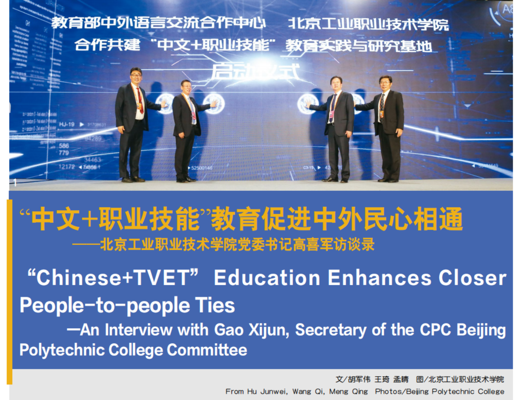 近日,《世界知識畫報》以“'中文+職業技能'教育促進中外民心相通——北京工業職業技術學院黨委書記高喜軍訪談錄”為題刊登了對高喜軍書記的專訪。高書記從中國-贊比亞職業技術學院里程碑式的成立意義、“中文+職業技能”融合對當地學生的發展成長、北工院在加強“中文+職業技能”融合方面的探索和實踐以及北工院未來在構建“中文+職業技能”教育高質量發展新體系的打算四個方面進行了訪談。