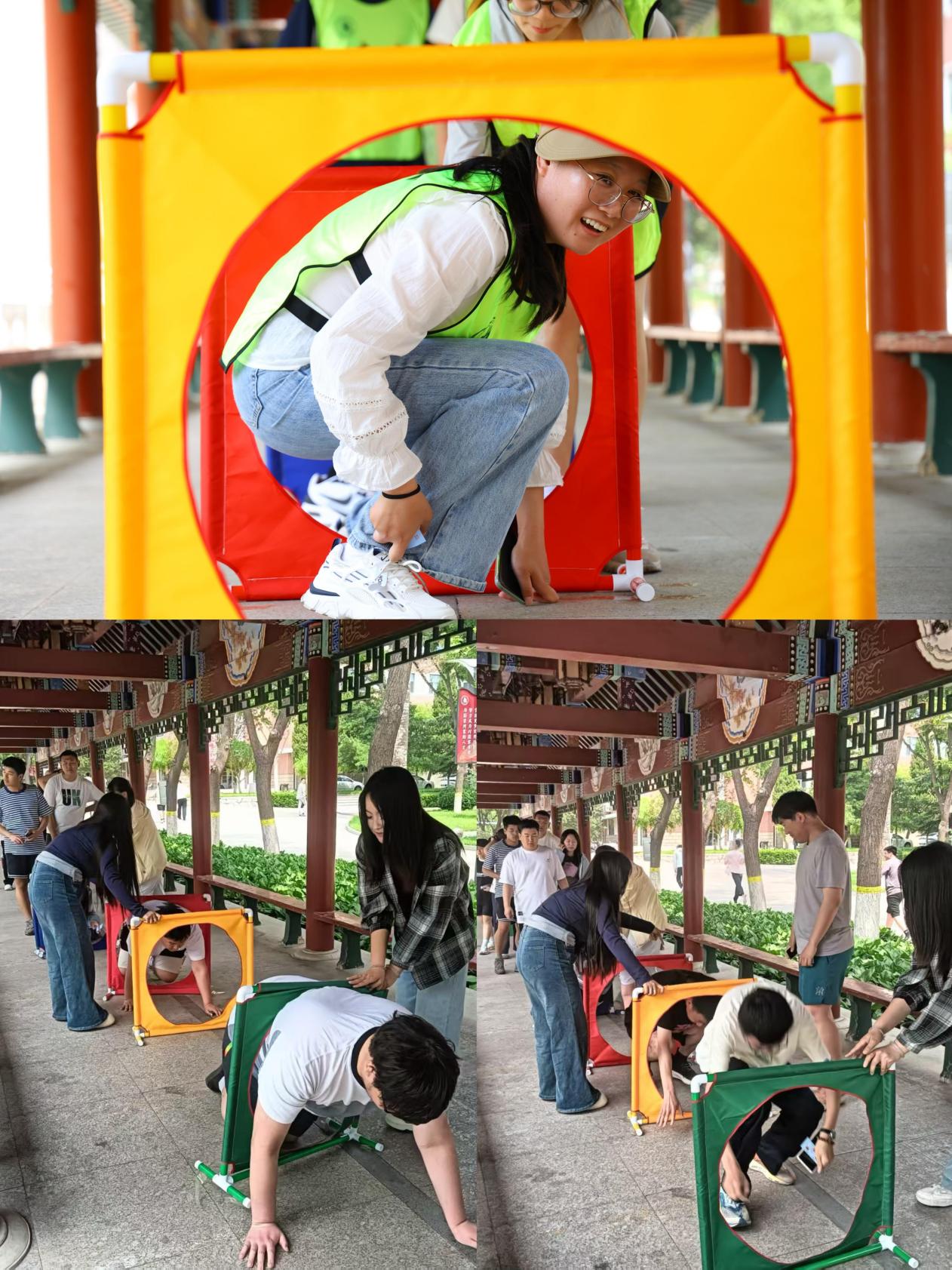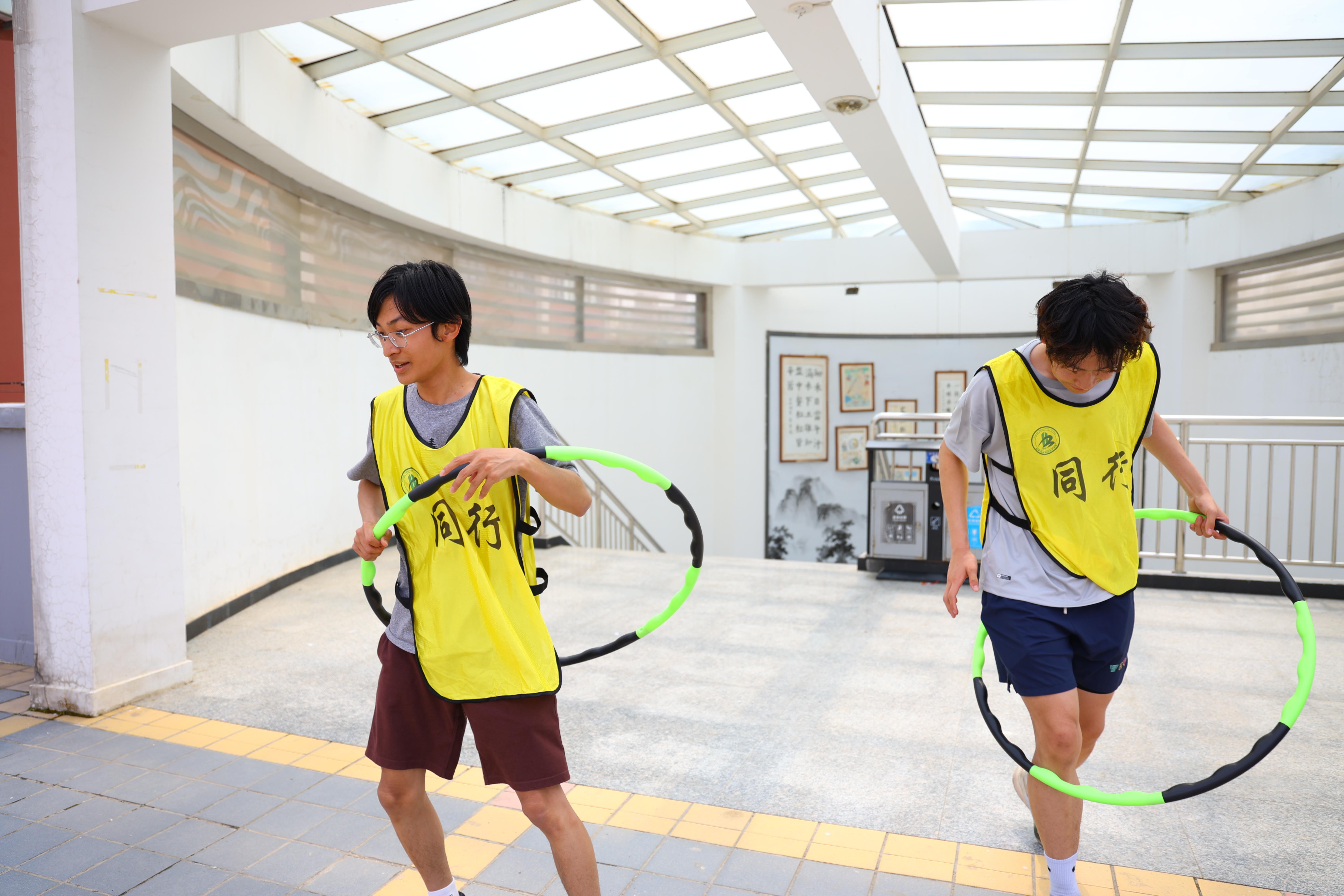七大趣味挑戰站點各具特色,充分實現運動與心理調節的深度融合。在 “幸運出發” 站點,參賽者于操場起點投擲巨型泡沫骰子,唯有擲出數字 6 方可開啟賽程,為比賽增添了緊張刺激的隨機趣味性;“福暈陀螺” 站點,參賽者需模仿 “大象摸鼻子” 姿勢原地旋轉 5 圈后觸摸 “?!?字,不僅考驗平衡能力,更寓意著福氣滿滿;在厚德樓旁的 “破障疾鋒” 長廊,參賽者們需快速穿越障礙,充分展現敏捷身姿與團隊默契;于四號公寓旁空地的 “煩惱拜拜” 站點,參賽者們紛紛寫下近期煩惱并投入 “煩惱桶”,以充滿儀式感的方式釋放壓力;食堂涼亭旁的 “手腳并用” 賽道,要求參賽者按圖索驥,團體成員還需佩戴背心粘取毛球,趣味橫生;食堂三層平臺的 “活力環扣” 項目,將呼啦圈與回形針創意結合,參賽者需邊轉圈邊穿針,挑戰身體協調能力;食堂前空地上的 “蛙力全開” 環節,參賽者需通過蛙跳運水,既考驗體力又需細心,團體成員更需通力協作保持水量達標。此外,活動還創新設計隱藏玩法,參賽者通過喊出 “我是最棒的”“美好的事情終會發生” 等積極口號與工作人員互動,即可獲得隨機小禮品,現場加油聲、歡笑聲此起彼伏。