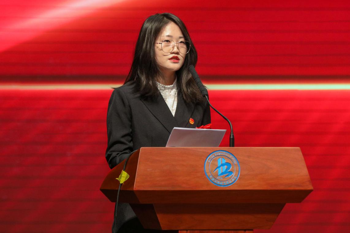 與會領導為獲得榮譽的集體和個人頒發了證書。優秀團支部代表機電2031班孟詩然和優秀共青團干部代表人工2031班李程凱撒兩位同學做了交流發言。