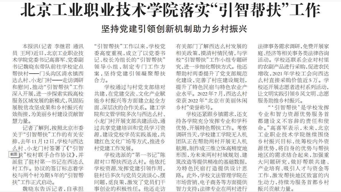 報道強調,“引智幫扶”是學校發揮專業和智力資源優勢服務首都建設義不容辭的責任和使命,未來,北京工業職業技術學院圍繞鄉村振興目標,統籌校內外資源優勢,將自身的優勢與幫扶地區的需求結合起來,加強重大問題研究,做好幫聯共建、產業培育、吸引人才與資金等工作,激發幫扶地區致富的內生動力,持續為服務首都鄉村振興貢獻力量。