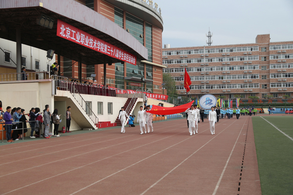 在莊嚴的升旗儀式后,黨委書記王偉宣布:北京工業職業技術學院第38屆田徑運動會開幕。