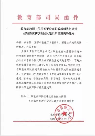 國家級職教創(chuàng)新團隊建設(shè)典型案例遴選旨在總結(jié)梳理首批全國職業(yè)院校教師教學(xué)創(chuàng)新團隊建設(shè)進(jìn)展、成果、特色工作,推廣一批在全國有影響力、具有示范引領(lǐng)作用的國家級職教創(chuàng)新團隊建設(shè)典型案例,進(jìn)一步加強職業(yè)教育教師隊伍建設(shè)。經(jīng)學(xué)校申報、上級主管部門推薦、教育部遴選,最終從122個首批全國職業(yè)院校教師教學(xué)創(chuàng)新團隊中遴選出典型案例30個。