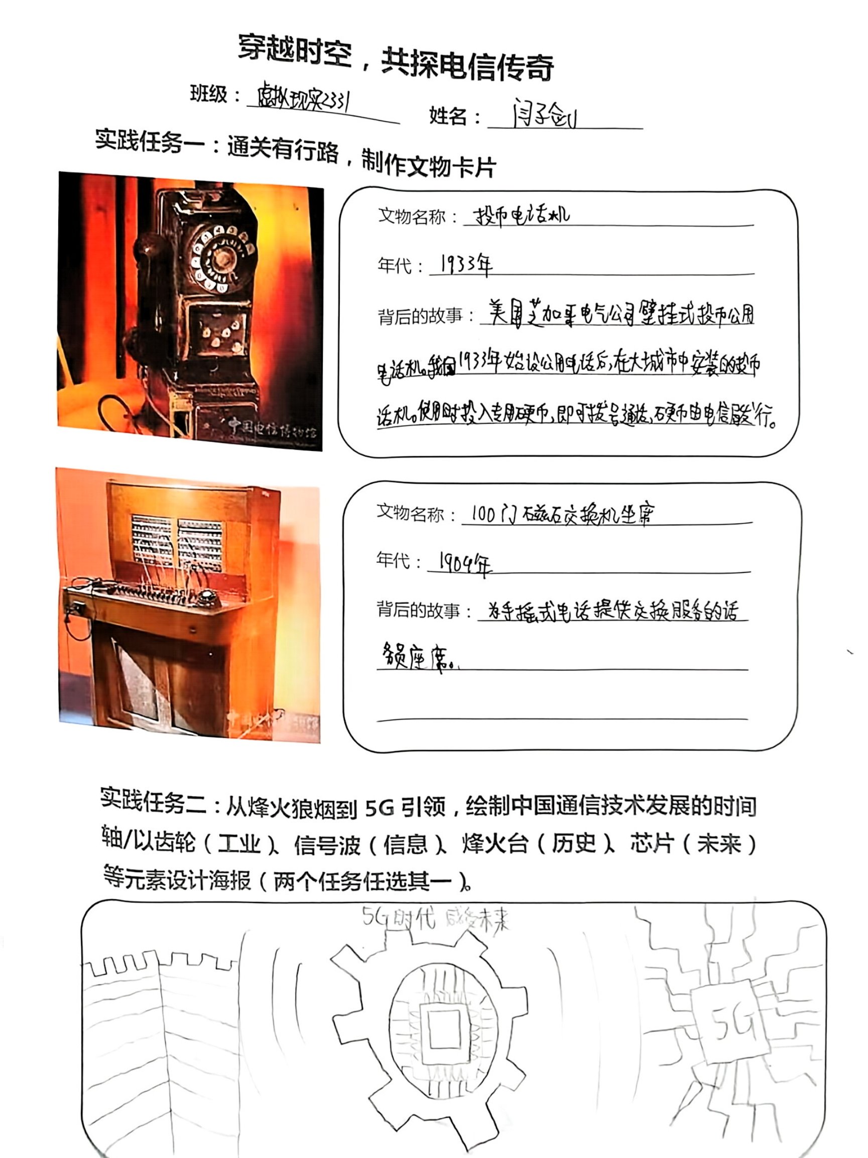 在前期充分調研與集體備課的基礎上,馬院老師精心設計了以 “穿越時空,共探電信傳奇”為主題的實踐手冊。手冊中設置了“通關有行路,制作文物卡片”“繪制中國通信技術發展時間軸”“以齒輪、信息波、烽火臺、芯片等元素設計海報”等任務,引導同學們在觀展中體會電信魅力。