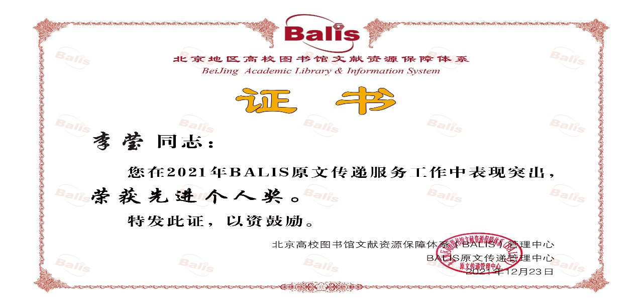 在北京地區82所參評高校圖書館中,我校圖書館綜合排名位列高職類圖書館榜首,榮獲2021年“BALIS原文傳遞先進集體獎”,李瑩老師榮獲BALIS原文傳遞服務工作“先進個人獎”。