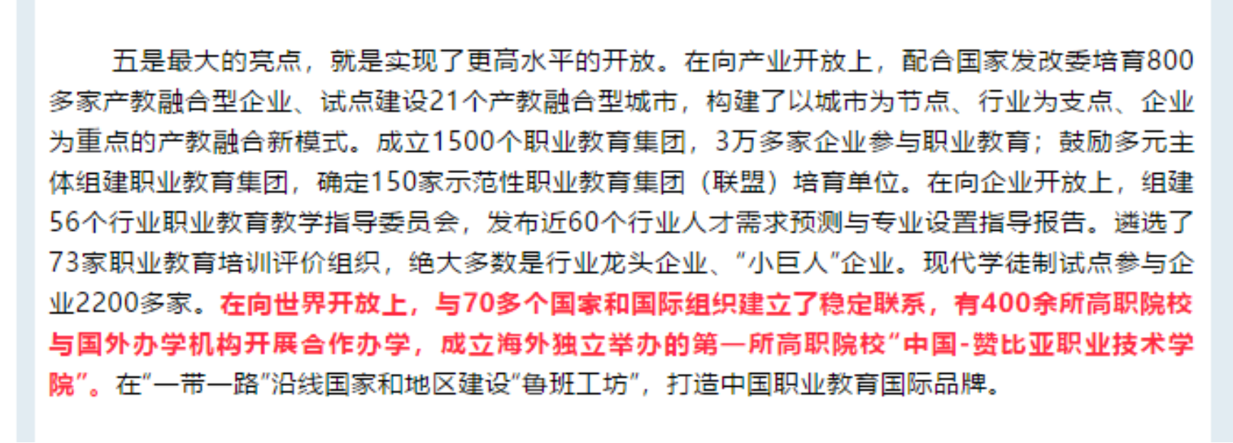 五是最大的亮點(diǎn),就是實(shí)現(xiàn)了更高水平的開放。在向產(chǎn)業(yè)開放上,配合國家發(fā)改委培育800多家產(chǎn)教融合型企業(yè)、試點(diǎn)建設(shè)21個(gè)產(chǎn)教融合型城市,構(gòu)建了以城市為節(jié)點(diǎn)、行業(yè)為支點(diǎn)、企業(yè)為重點(diǎn)的產(chǎn)教融合新模式。成立1500個(gè)職業(yè)教育集團(tuán),3萬多家企業(yè)參與職業(yè)教育;鼓勵(lì)多元主體組建職業(yè)教育集團(tuán),確定150家示范性職業(yè)教育集團(tuán)(聯(lián)盟)培育單位。在向企業(yè)開放上,組建56個(gè)行業(yè)職業(yè)教育教學(xué)指導(dǎo)委員會(huì),發(fā)布近60個(gè)行業(yè)人才需求預(yù)測與專業(yè)設(shè)置指導(dǎo)報(bào)告。遴選了73家職業(yè)教育培訓(xùn)評價(jià)組織,絕大多數(shù)是行業(yè)龍頭企業(yè)、“小巨人”企業(yè)?,F(xiàn)代學(xué)徒制試點(diǎn)參與企業(yè)2200多家。在向世界開放上,與70多個(gè)國家和國際組織建立了穩(wěn)定聯(lián)系,有400余所高職院校與國外辦學(xué)機(jī)構(gòu)開展合作辦學(xué),成立海外獨(dú)立舉辦的第一所高職院?!爸袊?贊比亞職業(yè)技術(shù)學(xué)院”。在“一帶一路”沿線國家和地區(qū)建設(shè)“魯班工坊”,打造中國職業(yè)教育國際品牌。