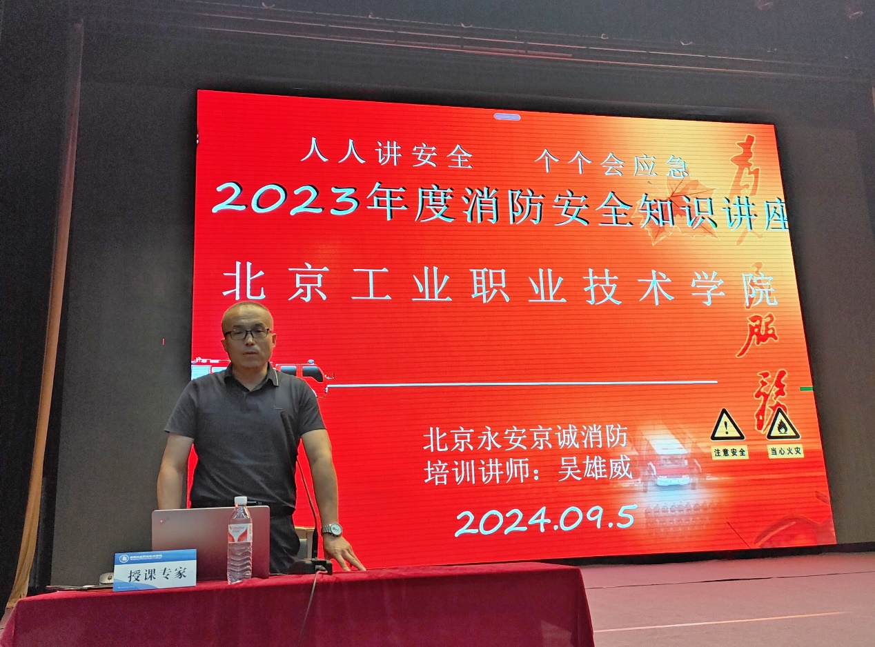 演練結束后,北京市永安宏泰防火咨詢服務中心吳雄威主任開展了消防安全知識講座。吳主任精心策劃并主講了消防安全知識專題講座,向全體新生普及了消防安全的核心要義與實用技能。吳主任通過生動的案例分析與現場演示,極大地提升了學生們對火災隱患的識別能力與自我保護意識,還教會了大家在緊急情況下如何迅速而有效地進行自救與互救,增強了學生的社會責任感和公民意識,為構建平安校園奠定了堅實基礎。
