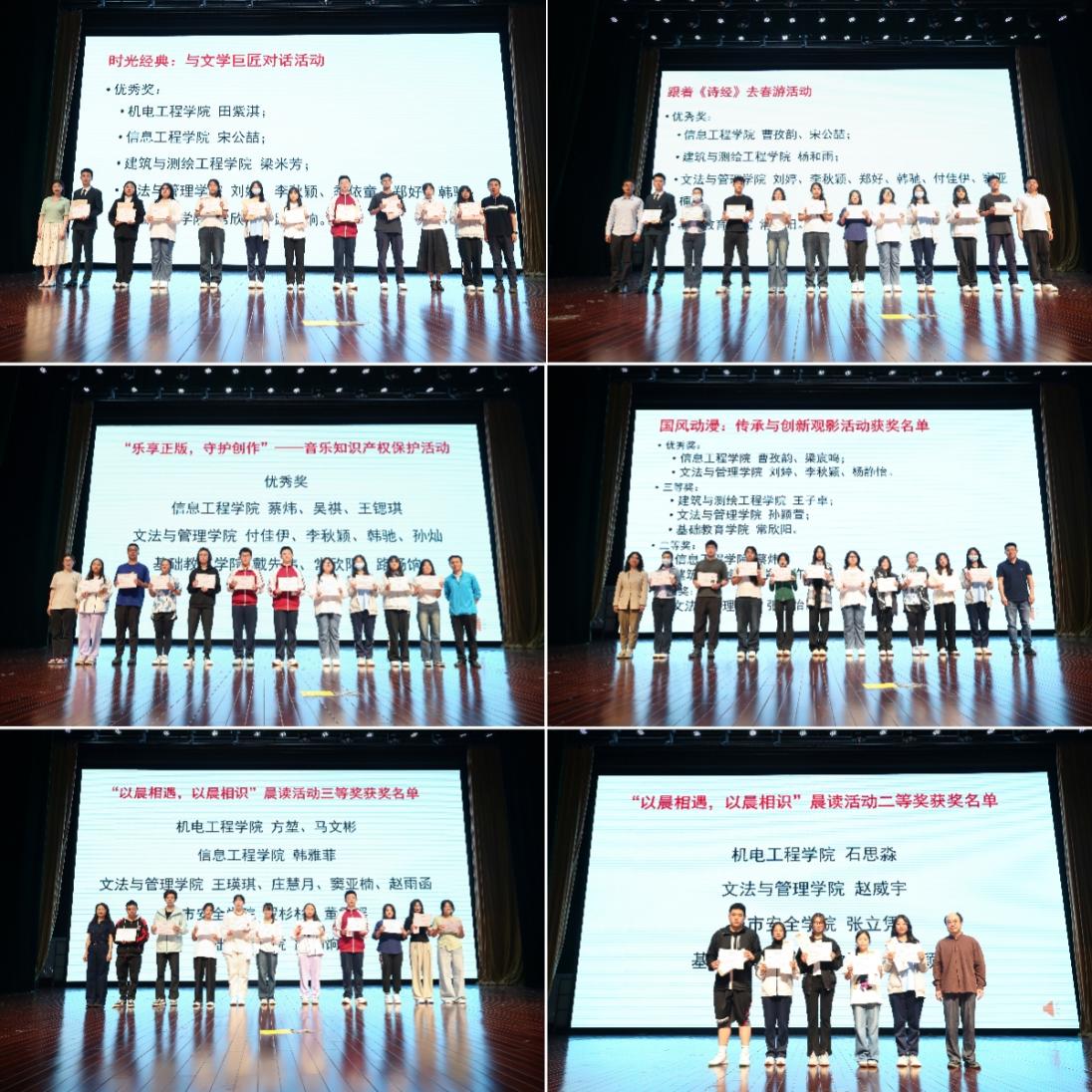頒獎典禮對讀書月七大活動中表現優異的師生現場頒發榮譽證書和獎品。七大活動分別為時光經典:與文學巨匠對話、跟著《詩經》去春游、“樂享正版,守護創作”——音樂知識產權保護活動、國風動漫:傳承與創新觀影活動、“以晨相遇,以晨相識”晨讀活動、2024年閱讀之星、“悅享資源,啟智人生”電子資源宣傳活動。