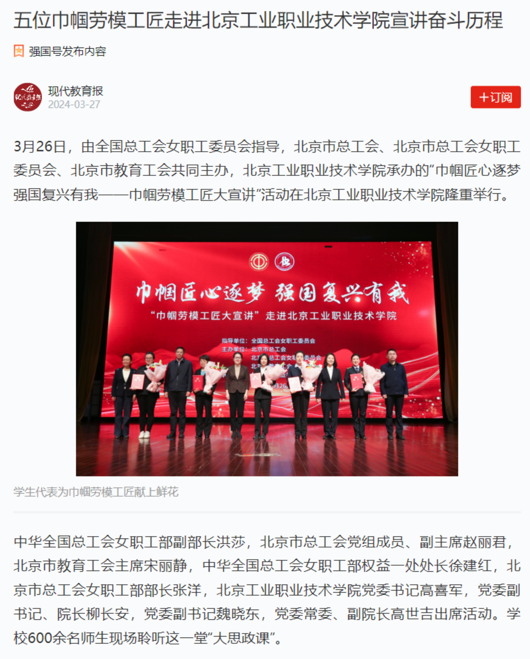 近日,“巾幗匠心逐夢 強國復興有我”巾幗勞模工匠大宣講活動在我校舉行,五位巾幗勞模工匠代表動情講述了她們詮釋勞模精神、勞動精神、工匠精神的奮斗故事,現場600名師生聆聽后用熱烈掌聲向她們表示致敬。《勞動午報》《北京日報》《現代教育報》等媒體紛紛關注報道,學習強國、中工網、今日頭條、北京市總工會官網、財經新聞網等進行了轉載。