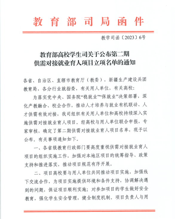 近日,教育部高校學(xué)生司印發(fā)了《關(guān)于公布第二期供需對接就業(yè)育人項目立項名單的通知》(教學(xué)司函〔2023〕6號),北京工業(yè)職業(yè)技術(shù)學(xué)院申報的4個項目均成功獲批教育部第二期供需對接就業(yè)育人項目。