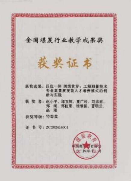 近日,從2024年全國煤炭行業教育教學成果表彰交流大會上傳來喜訊,我校在全國煤炭行業教育領域榮膺多項大獎。建筑與測繪工程學院副院長鄭闊榮獲全國煤炭行業教學名師稱號;占文鋒教授為帶頭人的智能建造技術專業教學團隊榮獲優秀教學團隊獎;趙小平教授負責的《四位一體 四線貫穿:工程測量技術專業高素質技能人才培養模式的創新與實踐》項目獲教學成果特等獎。