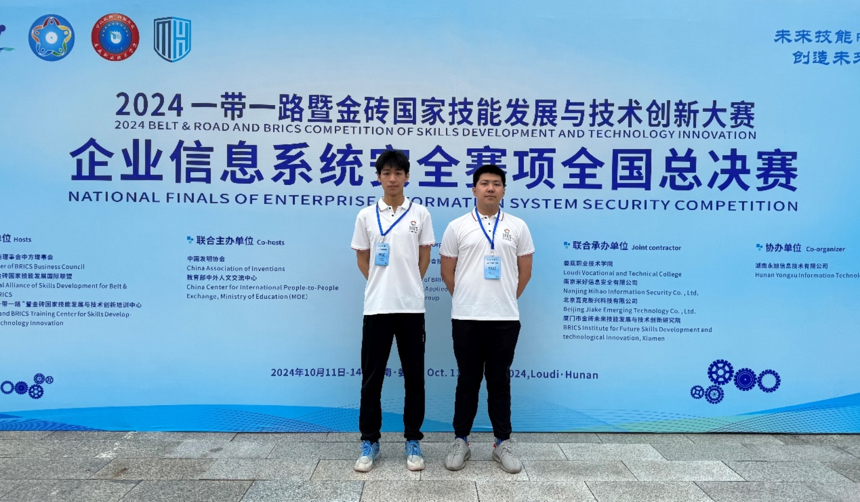 10月13日,2024一帶一路暨金磚國家技能發展與技術創新大賽之企業信息系統安全賽項全國總決賽在婁底職業技術學院舉行。在這場匯聚了全國職院校精英的激烈角逐中,我校信息工程學院的參賽選手在84支隊伍中脫穎而出,網絡1971班的李志鑫、劉金碩榮獲全國二等獎(銀牌),我校榮獲優秀組織獎。