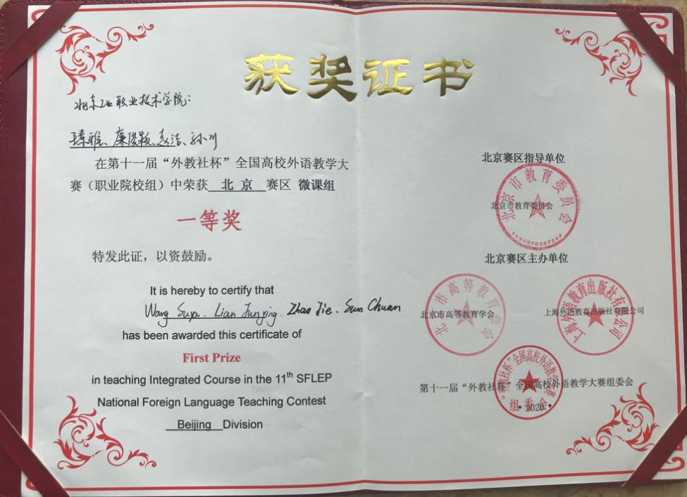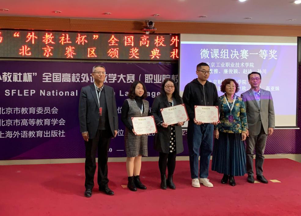 2020年10月25日上午,第十一屆“外教社杯”全國高校外語教學大賽(職業院校組)北京賽區比賽在北京經濟管理職業學院隆重舉行。本次大賽由北京市教育委員會全程指導,北京市高等教育學會、上海外語教育出版社主辦,北京市高等教育學會大學英語研究會、北京高校大學英語教育發展中心協辦。我校基礎教育學院英語教學團隊(王素雅、廉俊穎、趙潔、孫川)以第2名的成績喜獲微課組一等獎。